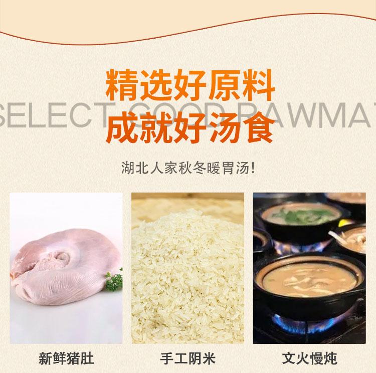 湖北人家秋冬暖胃汤,精选新鲜猪肚为主要食材,原料严格筛选,确保肉质鲜嫩无异味。此汤口感独特,深受食客喜爱。 我们特别添加了手工阴米熬煮,阴米口感软糯香甜,与猪肚鲜美融合,使汤品口感层次分明。采用文火慢炖,让两者香味充分释放、渗透,达到最佳口感。