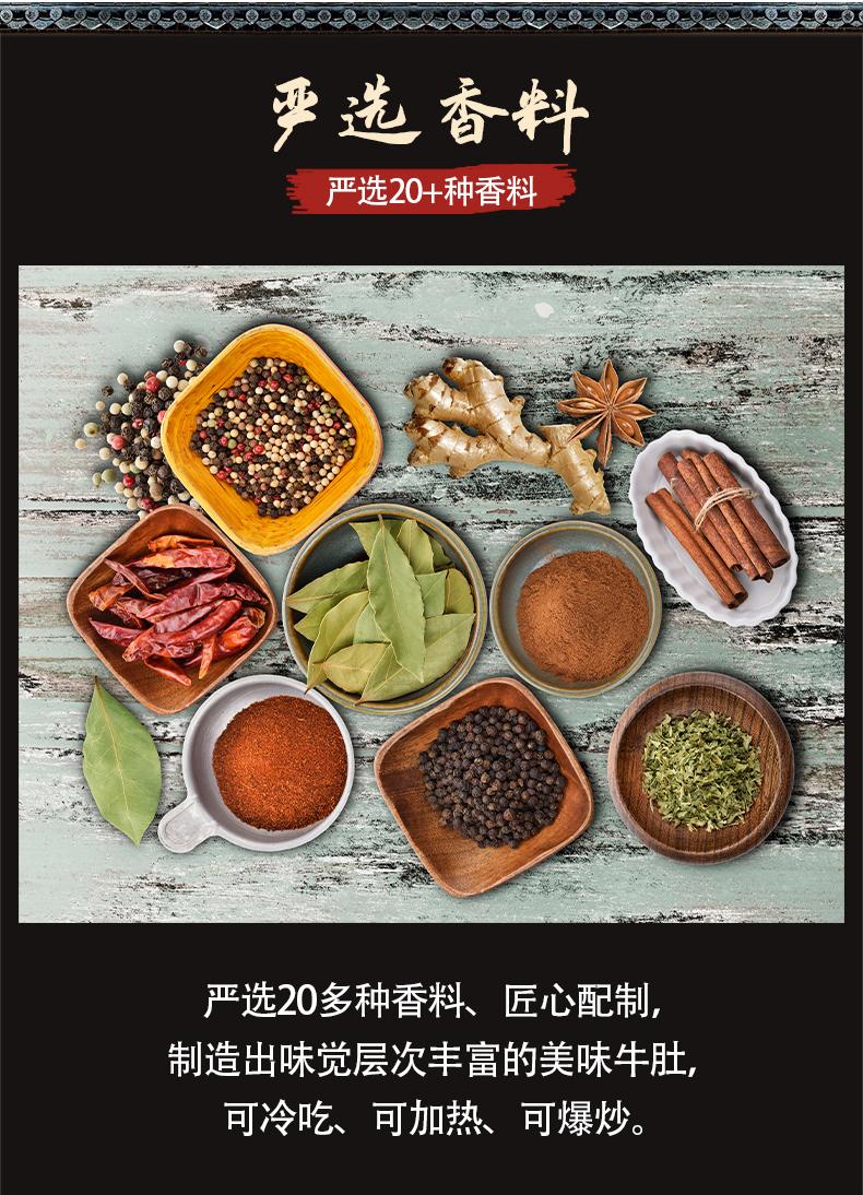 严选来自各地的20多种优质香料,每一种都经过精心挑选,确保其纯正与新鲜。通过匠人般的精湛技艺与独特配方,将这些香料巧妙地融合在一起,制造出味觉层次极为丰富的美味牛肚。